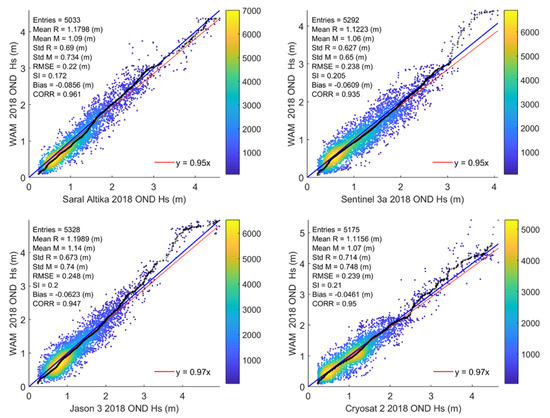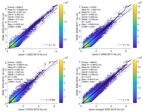 Scatter plots showing satellite measurements versus modelled significant wave heights (BS-WAV MY) for 2002–2013 (Jason-1), 2008–2017 (Jason-2), 2016–2018 (Jason-3), and 2002–2018 (all satellites merged). Additionally, the following are presented: the estimated bivariate probability density (colored area), the linear slope-fit regression of modelled and observed wave heights (red line), specific quantiles taken from the empirical cumulative density function (black line), and the diagonal (blue line). Summary statistics and skill scores are also included. R: reference (satellite) data, M: model data.