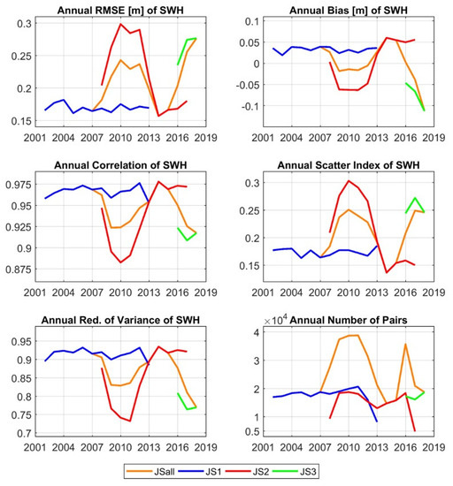 Figure 15 includes a time series of statistical parameters of the BS-WAV MY product for the complete validation period between 2002 and 2019. On this annual scale, the metrics show that the skill level in all of the statistical parameters varies for the individual satellites. While the values for the bias are always around zero for Jason-1 and Jason-2, the bias for Jason-3 is slightly higher, as shown by the green curve in Figure 15 for the Annual Bias from 2016, and proves the underestimation of 7–10 cm of the measurements by the wave model.