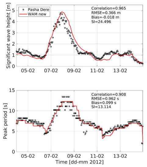 Overall, the skill scores depend to some extent on the number of collocated measurements. Clearly, with a decreasing number of observations, the values for the statistical parameters such as RMSD, bias, and scatter index go up, while those for the reduction of variance and the correlation go down. For 11 days, from 4 February 2012 to 15 February 2012, ADCP data were available at the location Pasha Dere (located at 28.03° E, 43.08° N) in the western part of the Black Sea near the Bulgarian coast. This period covers a storm event that occurred between 7 and 9 February 2012. A comparison of the significant wave height and peak period with WAM is shown in Figure 16. The measured and modelled time series of the significant wave height and peak period show a very good agreement. The skill scores support the findings. The bias for the significant wave height is only about −2 cm, while the RMSD is 37 cm. The corresponding values for the peak period, which depend on the resolution of the model frequency, are also very good, with a bias of 0.1 s and an RMSD of about 1 s. The correlation is very high for both integrated parameters: about 0.97 for the significant wave height and 0.91 for the peak period. The peak of the storm was also simulated quite accurately and perfectly illustrates the capacity of the wave model to represent the arrival of a storm as captured by the observations.