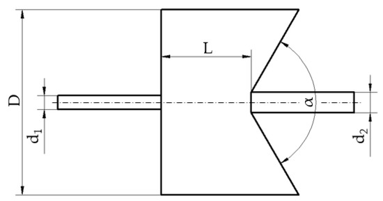 The geometric model of the self-excited oscillating cavitation jet nozzle is shown in Figure 1. The inlet diameter of the cavity mainly composed of the self-excited oscillating cavitation jet nozzle is d1, the outlet diameter of the self-excited oscillating cavitation jet nozzle is d2, the diameter of the cavity is D, the length of the cavity is L, and the impact angle of the cavity is α. To facilitate the analysis and summary of regularity, the subsequent simulation analysis adopted the dimensionless form, and the specific value range is listed in Table 1.