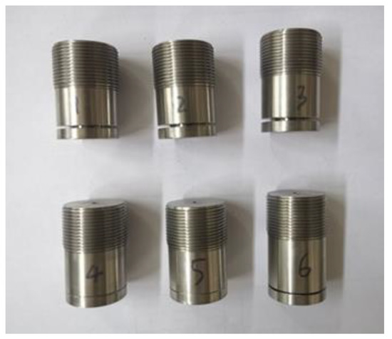 The test bench was built in the laboratory of National Research Center of Pumps at Jiangsu University. Figure 3 is a schematic diagram of the degradation test rig of self-excited oscillating cavitation jet nozzle (1 plunger pump; 2 pump pressure gauge; 3 pressure regulating relief valve; 4 electromagnetic flowmeter; 5 pressure gauge; 6. self-excited oscillation cavitation jet nozzle; 7 jet platform; 8 tank; 9 filter; 10 valve). A model KEFC-P-25G6-CNTNL7 intelligent electromagnetic flowmeter with a diameter of DN25, error ± 0.5% made by Shanghai Kent (Shanghai, China) was selected as the flowmeter. During installation, the distance between the straight pipe section in front of the flowmeter should be no less than 10 × 25 mm, and the distance between the straight pipe section in back of the flowmeter should be no less than 5 × 25 mm, so as to ensure the accuracy of the flowmeter measurement process. The nozzles of self-excited oscillating cavitation jet were numbered as shown in Figure 4, where #1–3 and #4–6 could be combined with each other because they adopted the same cavity diameter structure, respectively.