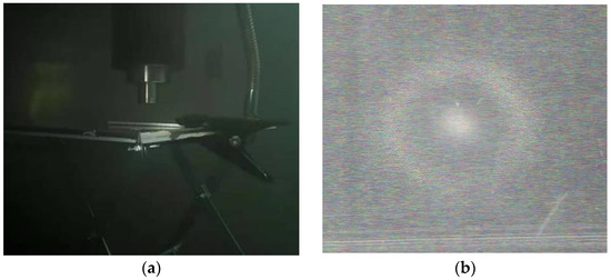 Picture of cavitation jet experiment and results. (a) Picture of cavitation jet experiment; (b) Picture of experimental results.