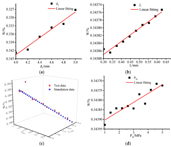 Table 6 indicates that a stepwise linear regression method was adopted to determine the coefficient under different solid particle contents and different particle diameters. Only when the content was 5% and the particle diameter was 0.1 mm and 0.2 mm, the coefficient was above 0.9, while the residual diameter coefficient was small. It was therefore suggested that the linear equation established by stepwise regression between design parameters and vapor volume fraction exhibited high accuracy. However, the determination coefficients were not above 0.9 under other conditions, whereas they were close to each other.