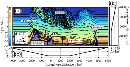 XB-SB was implemented on a regular grid rotated by to a local coordinate system extending 4000 m and 10,000 m in the cross-shore x and longshore y direction, respectively (Figure 2a). The computational domain comprises offshore small-scale bedrock and a sand deposit lobe (x < −2000 m) which play an important role in wave transformation [29,30]. Close to the shore, the domain comprises the Adour dike, the six groynes within Anglet beaches, the field site PCA and the Saint-Martin headland, the GPB adjacent embayment and its southern headland (GPB headland). Because the Anglet beach bathymetry was not available, the latter was manually filled by the alongshore-averaged cross-shore transect of PCA, from the southernmost groyne to the Adour dike (1000 m < y < 5000 m). To apply periodic conditions at the lateral boundaries and to avoid boundary effects under high-energy wave forcing, the bathymetry was extended in the longshore direction at both boundaries using an alongshore-averaged cross-shore transect from the northern part of the Adour dike. These lateral extensions were made large enough (2000 m and 1000 m at the southern and the northern boundary, respectively) to prevent side effects due to the presence of the GPB headland and the Adour dike. The mesh step size was set to 5 m at PCA, gradually increasing to 25 m close to the boundaries (Figure 2b,c).