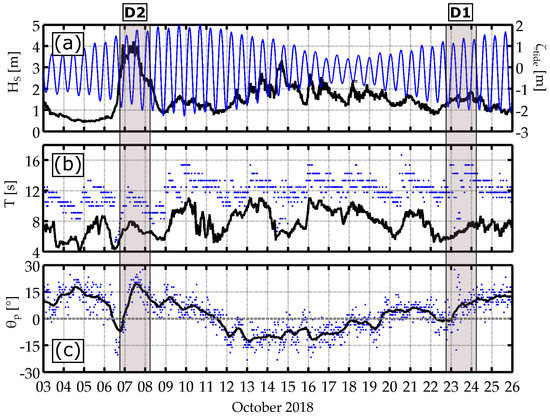 Offshore wave and tide conditions during the field experiment, with low- and high-energy deflection event (D1 and D2 shown by shaded areas). (a) Tidal level (; blue line; see right axis) and significant wave height (; black line). (b) Peak wave period (; blue dots) and mean wave period (; black line). (c) Peak wave angle of incidence with respect to the shore normal (; blue dots) and its 12h-averaged values (black line). Positive values mean a deflection configuration (see Figure 1c).