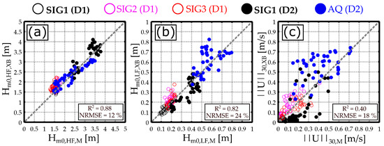 Measurements (subscript M) versus model (subscript XB) for events D1 and D2 and for each instrument. (a) Significant short wave height ( and ); (b) Significant infragravity wave height ( and ); (c) 30 min-averaged velocity magnitude ( and ). The corresponding coefficient of correlation and normalized root-mean-squared error (NRMSE) are indicated in each panel.