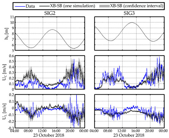 Modelled mean water depth (; top panels). Modelled (black) and measured (blue) 5 min running-averaged cross-shore (; middle panels) and longshore velocities (; bottom panels) for event D1 at SIG2 and SIG3 locations. Note that AQ was not measuring at this time. Black line and grey area show the modelled velocities of one simulation and the confidence interval computed from ten simulations (see Section 2.3).