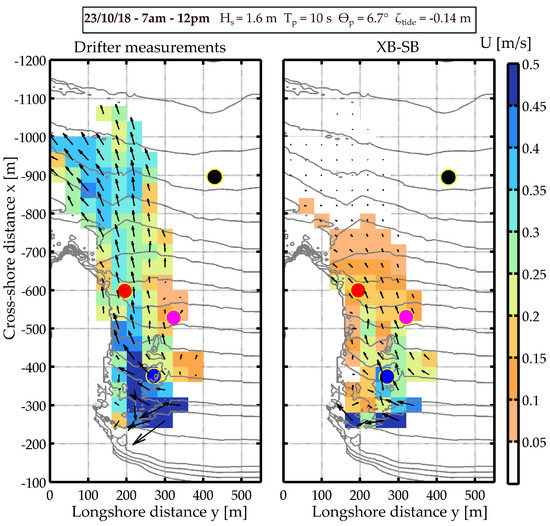 Mean Lagrangian velocity field measured at the surface (Drifter measurements; left panel) and mean modelled velocity field (XB-SB; right panel) interpolated onto the drifter grid. The top white square shows the period of averaging and the corresponding offshore wave conditions (, , ) and tide level ().