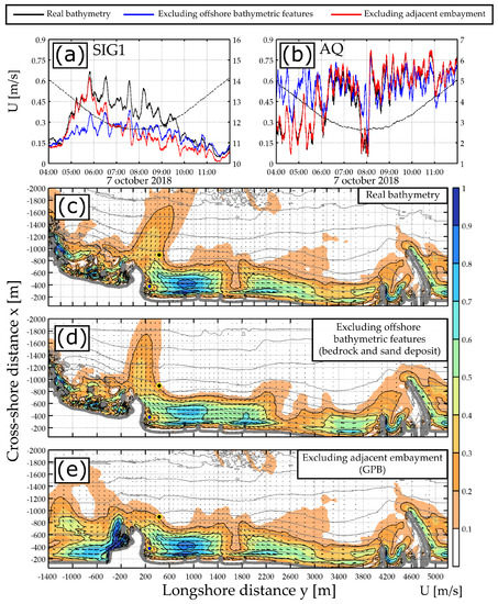 The upper panels of Figure 10 show time series of the modelled velocity magnitude at SIG1 (a) and AQ (b) for the real bathymetry and for scenarios 3 and 4. The other panels show the large-scale modelled velocity field averaged at low tide for each considered scenario in the upper panels. Excluding the morphological features leads to a considerable drop of velocity magnitude at SIG1, as mean values are halved (Figure 10a). This is because SIG1 is nearly outside the deflection rip head for both idealised scenarios (Figure 10d,e). The presence of offshore bathymetric features leads to a significant longshore variability of the longshore current magnitude along Anglet beaches (at y ≈ 1600 m in Figure 10a). Such a variability is caused by the longshore variability of wave height and wave angle of incidence at breaking, enforced by wave refraction across the offshore bedrocks and sand deposit lobe (not shown here; in line with [29,30]). Excluding offshore bathymetric features leads to the smoothing of the longshore variability of the longshore current but does not significantly affect the deflection pattern. A change of the deflection rip head, becoming fully offshore-directed, is to be noted. On the other hand, excluding the adjacent embayment strongly alters the deflection pattern (Figure 10e). For such a scenario, the PCA longshore current is not deflected offshore and is transmitted to the other side of the headland, as anticipated by the conceptualised mechanism of [6] when < 1.25. These findings highlight the crucial role of the adjacent embayment in the full deflection scenario at PCA during event D2.