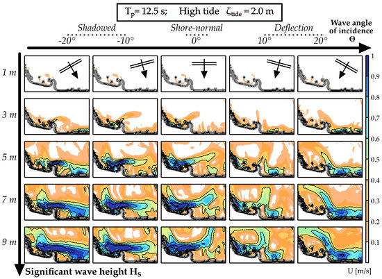 Modelled mean velocity field under various offshore significant wave height and wave angle of incidence at high tide ( = 2.0 m). Black lines indicate the 0.4, 0.6, 0.8 and 1.0 m/s contours. The grey line shows the mean sea level contour.