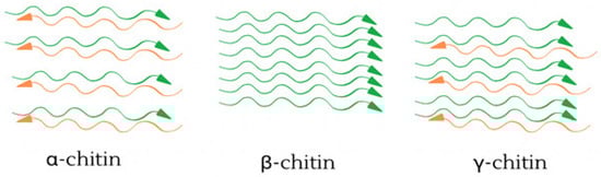 Chitin is commonly found in the shells of crustaceans, the exoskeleton of various insects, cell walls of coralline algae and many other marine organisms, fungi, plants, and bacteria [1,2,3]. Chitin from marine sources has plenty of advantages over land animal sources, such as minor regulatory and quality control problems, an almost negligible presence of biological contaminants and toxins, low inflammatory response, and they are more metabolically compatible. This biopolymer has many applications within the medical (includes tissue regeneration, wound dressing, cancer treatment), environmental, and agricultural sectors (see Figure 1). Figure 2 shows that chitin is a major (1–4)-linked N-acetyl-ß-D-glucosamine polysaccharide that gives species a hard exterior [2,3,4,5]. The unique characteristics of chitin mirror the similar structure found in cellulose, but in chitin, an acetamide group is found on the C-2 position rather than a hydroxyl group at the same position (see Figure 2). Chitin itself has three different structures denoted as α, ß, and γ (Figure 3) that differ in the orientation of chains that are either bonded in piles or sheets connected by hydrogen bonds through various amide groups [2,3].