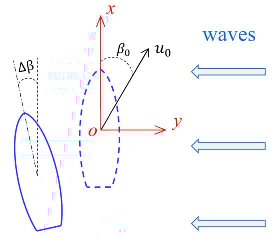 In order to investigate a ship’s hydrodynamic performance in waves by means of a towing tank test, it is generally required to use something like soft rope or a spring to restrict the ship’s slow-drift motions of surge, sway and yaw due to the waves. Figure 1 illustrates the situation of a ship model towed obliquely in regular beam waves. The oblique angle is defined in the horizontal plane when the ship (shown by the dashed line in Figure 1) is towed obliquely with a velocity of in calm water. Due to the actions of both the waves and spring, the ship will oscillate periodically around a mean position in space. The mean position, e.g., the position of the ship shown by the solid line in Figure 1, is determined by , , spring stiffness, wave length, wave height, and wave incident angle. In such a situation, the mean ship heading is different from the ship heading in calm water, and the mean oblique angle can be assumed as , where is caused by the spring and slow-drift effects of waves. Note that is not zero when the ship moves obliquely, even in calm water, because the deformation of the spring system will occur, producing forces and moments which balance the hydrodynamic forces and moments acting on the ship. Therefore, the real oblique angle in calm water is also a sum of and . It is the same thing for the wave incident angle. If the wave incident angle is defined in the horizontal plane when the ship is at rest in calm water, the real-time incident wave angle will change periodically as the ship oscillates in the waves, and the mean incident wave angle is then , where is caused by the spring and slow-drift effects of waves as well.