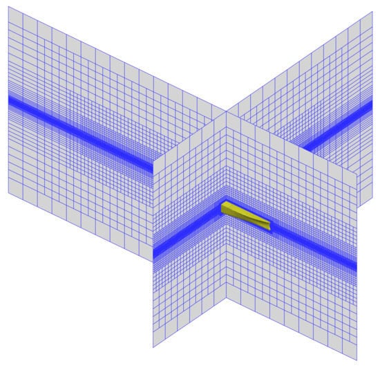 The - SST turbulence model [] is employed to approximate the eddy viscosity in Equation (4), where SST is the acronym of Shear-Stress-Transport, and is the specific dissipation rate. The method of VOF (Volume of Fluid) is applied to capture the free surface of the water–air flow.