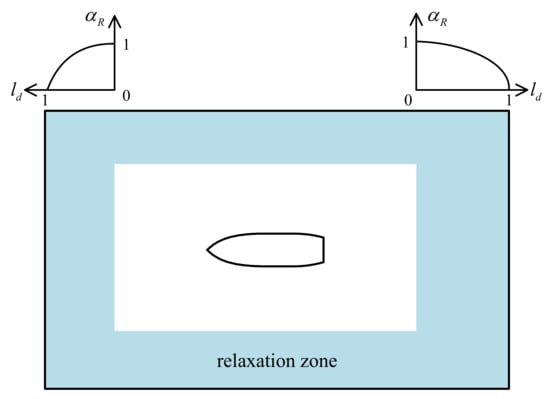 The four far boundaries at , and , are considered to be wave boundaries, on which the wave evaluation and flow velocities are specified by Equation (5) and Equations (6)–(8), respectively. In order to prevent wave reflection, relaxation zones adjacent to these boundaries are set up. A relaxation function is applied inside the relaxation zones. The function expression [] is below.