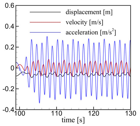 The forces and moments directly from RANS are obtained by integrating the pressure and viscous stress over the hull surface. The pressure is the total pressure, including the dynamic pressure and static pressure. In the present consideration, the forces and moments, as well as the ship motions, are evaluated at the center of gravity in the completely ship-fixed coordinate system. This means that the results from RANS have to be transformed from the horizontal coordinate system to the ship-fixed coordinate system during the data post-processing. The low-frequency components and high-frequency components of force, moment or motion can be extracted by regressing the time histories of the RANS results. Figure 4 presents the computed time histories of the displacement, velocity and acceleration of the surge motion for a case. The surge displacement contains the initial longitudinal elongation of the spring system which produces a force to balance the ship resistance in calm water. As observed, the traces are explicitly characterized by two different periods. One is excited by waves, which is definitely consistent with the wave period. The other is due to the spring system, and larger than the wave-induced one. In order to separate out the low-frequency component and high-frequency component from the time histories, Fourier series with double frequencies, i.e., Equation (1), are employed to regress the time histories. The Fourier series taken here are up to the fifth order. The spring frequency obtained from regression analysis is around 1.604 s−1, corresponding to a period of 3.92 s.