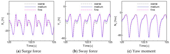 In order to ensure enough grid resolution, grid dependency analysis is carried out for the case and in head-wave conditions. Coarse, medium and fine grids with around 0.26, 1.69 and 10.52 million cells are generated, respectively, by systematically doubling the cell size in three dimensions. As mentioned, during RANS computations, the virtual wave maker is inactive within the first 100 s, i.e., in calm-water condition, then afterwards wave generation starts. Table 3 presents the computed surge force, sway force and yaw moment in calm water using the three grids. As seen in the table, the change of force or moment becomes smaller with the increasing grid resolution. The maximum discrepancy between the results on the medium grid and fine grid is below 3%. The segments of the computed time histories of the surge force, sway force and yaw moment after activating the wave maker are shown in Figure 5, and the RMSE (Root-Mean-Square Error) is presented in Table 4. Note that the forces and moment in the figure are due to hydrodynamics and hydrostatics, without including inertia effects. The time traces also display the tendency towards convergence, as desired. The medium grid seems to be of enough resolution for the selected case. In order to reduce the computational time, the medium grid is therefore used for the other cases considered.