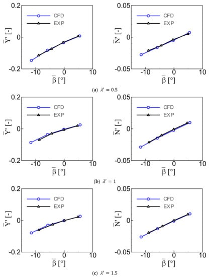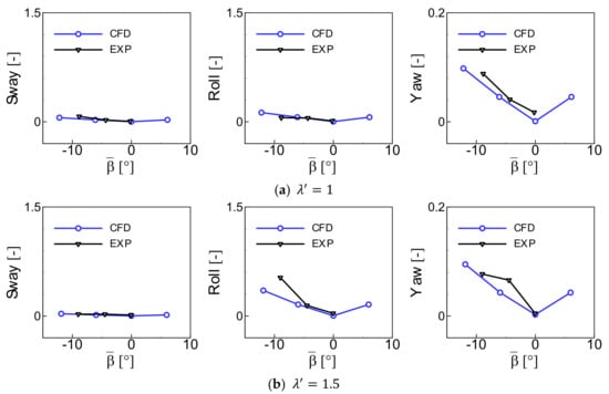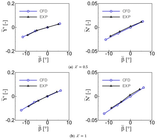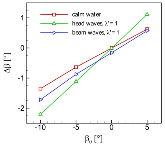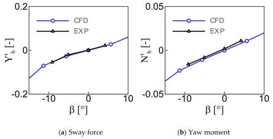 In order to validate the present computed results, they are compared with the experimental data published by Yasukawa []. The experimental data should include the inertia effects. The mean surge force, sway force and yaw moment, including inertia effects, may be expressed in a ship-fixed coordinate system as