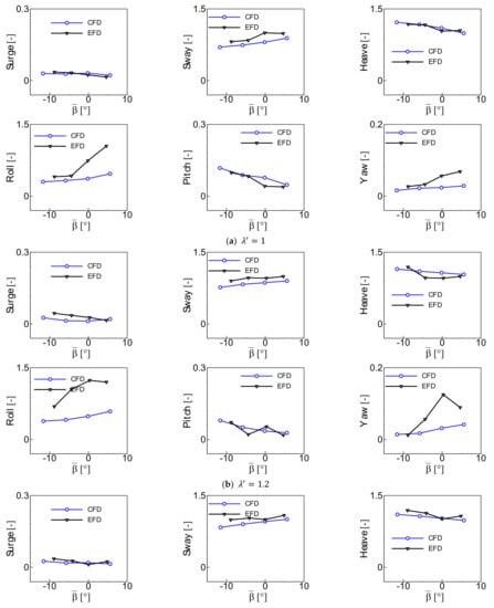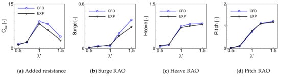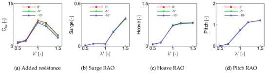 The oblique angle has non-negligible influences on added resistance, especially for long waves, as shown in Figure 10. For a larger , the added resistance decreases in general, especially in long waves. The influences may be due to the different mean oblique angle and the different mean encounter wave angle , as and , where and are related to and the wave length. However, these seem not to affect the RAOs of surge, heave and pitch (see Figure 10), as the curves of the RAO versus the wave length are almost coincident, although is different.