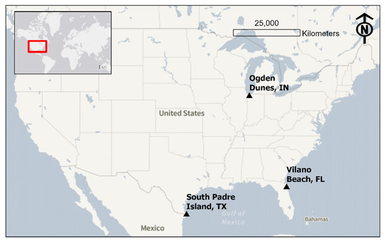 In order to realistically approximate the conditions of actual nearshore nourishments, model inputs were derived from historical project sites. These sites, located within three contrasting coastal regions of the U.S., were selected to represent a range of wave climates and nearshore geomorphologies. The sites selected were South Padre Island, TX (SP); Vilano Beach, FL (VB); Ogden Dunes, IN (OD), which represent the Gulf of Mexico, East Coast, and Great Lakes regions, respectively (see Figure 1). These locations have been the site of nearshore placements in the past, as well as data collection efforts, which further facilitated model set up. Bathymetry and wave climate data were required from each site to create inputs for each model scenario. Overall, OD has less energetic waves and a steeper offshore profile than the other sites and is situated within a large interior lake (Lake Michigan); SP has more energetic waves than OD, but it has shorter wave periods than VB due to wave generation occurring within the Gulf of Mexico; VB has longer period waves originating within the south Atlantic Ocean and is the most energetic of the three sites. Additional wave climate details are described in Section 2.1.4 and the reader is referred to Figlus et al. (2021) [27], Brutsché et al. (2017, 2019) [7,28], and Young et al. (2020) [26] for more site characterization at SP, VB, and OD, respectively.