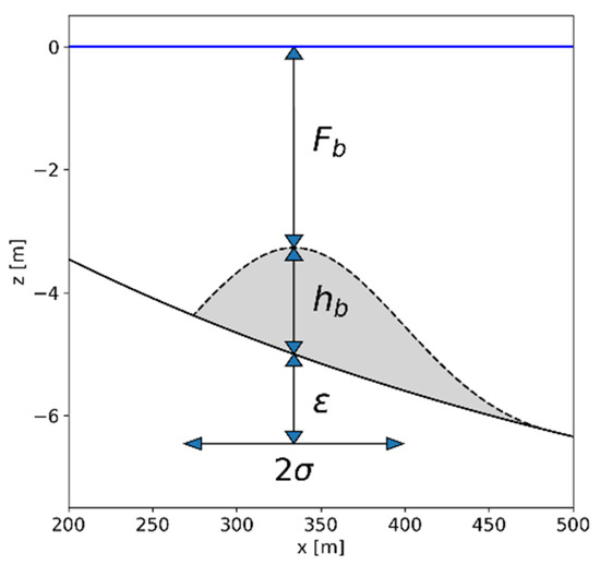 where is the cross-shore distance to the berm crest, and and are the scale and width parameters, respectively, used to approximate the berm as it intersected the underlying equilibrium profile. To generate congruent berm shapes across the range of cases, the berm’s height above the bed () was held constant for each berm type, and the ratio of the Gaussian function’s amplitude () to its width () was also held constant (see Figure 3). For each Gaussian curve generated, an algorithm incremented , then calculated and , which continued until the seaward tail of the Gaussian mound was less than 1 mm from the equilibrium profile. The result was a smooth equilibrium profile exhibiting berms with similar geometric properties. See Figure 4 for a demonstration of the SP profile with the three LBs placed at depths of 3 m, 5 m, and 7 m. Note that the initial depth of the berm crest, , is the same between profiles, but the berm’s cross-sectional area may be somewhat smaller or larger depending on the profile’s local slope and curvature. The discrete mound cases had smaller in order to approximate a hopper dredge capacity of 360 ± 60 m3.