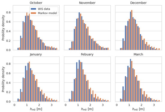 Monthly wave height PDFs of the WIS (blue) and Markov chain model results (orange) used as input to the VB scenario. Starting at the upper left, and from left to right, the panels show PDFs for October through March.