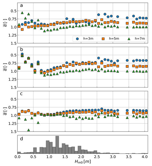 The discrete mounds shown in Figure 9c have a less pronounced impact on wave transmission compared to the linear and undulated berms. This is expected, considering the energy attenuation results shown in Figure 8. While some of the large enhancements of wave power introduced by the DM may not be convincing and some are likely outliers (i.e., in the bin for ), there is yet a noticeable trend of increased wave power ( for the placement. This trend holds for a majority of the wave height bins, potentially indicating that the small mounds induced wave shoaling.