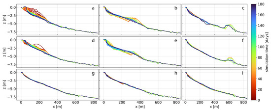 Central profile evolution for SP, where color indicates elapsed simulation time. (a–c) LB at 3 m, 5 m, and 7 m depths, respectively. (d–f) UB at 3 m, 5 m, and 7 m depths, respectively. (g–i) DM at 3 m, 5 m, and 7 m depths, respectively.