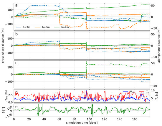 Time series of cross-shore (solid line) and alongshore (dashed lines) displacements of nearshore nourishment sediment for the Vilano Beach scenario for 3 m (blue lines), 5 m (orange lines), and 7 m (green) placement depths, respectively. (a) Linear berm; (b) undulated berm; (c) discrete mounds; (d) offshore wave height and peak period; (e) wave direction relative to shore-normal.