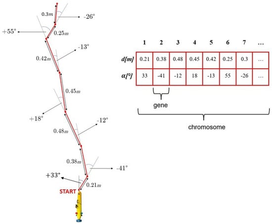 According to assumptions 2 and 3, represents the space free from obstacles of the area in which the vehicle can move, expressed in North and East coordinates. The AUV paths generated by the GPP strategy are described using chromosomes and genes, essential elements of general genetic algorithms (more details in Appendix A.2). In particular, a chromosome represents a path, and it is composed of m genes, each of which describes a step of the path. Within this work, a gene has been characterised as a tuple , where represents the increment of the AUV heading angle and d the length of the step of the path. The angle follows a Gaussian distribution with zero mean and with standard deviation , while d is sampled over an uniform distribution with a range scaling with the size of the area to inspect. Figure 1 shows an example of a chromosome along with its genes.