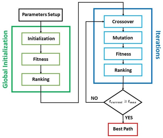 Figure 2 shows the flowchart of the designed GPP algorithm. The “Parameters Setup” block provides the parameters used to initialise the process, including initial population size n, chromosome length m, and all those parameters affecting the evolutionary operations of the algorithm. The initial population of chromosomes is generated in the “Global Initialisation” phase depicted in the green box. On the other hand, the blue box reports the iterative part of the algorithm, in which the genetic operations take place. In order to execute the planner on board of an AUV, without issues on the global computation resources, the duration of the iterative phase is limited to . In the following, more details will be given for all the phases of the algorithm, except for the “Ranking” phase, which is a sorting and removing operation to maintain only the k best chromosomes in the population. Details about the Consistency check operation, which ensures path generation within , are also provided in a dedicated subsection.