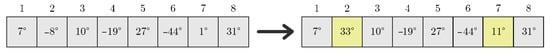 The mutation helps to explore the entire , maintaining population diversity [] and avoiding local minima. For a binary representation of a gene, a simple mutation consists in inverting each gene value with a small probability, changing 0 to 1, and vice versa []. Conversely, in the GPP algorithm proposed here, genes are represented by a tuple of value . Thus, the mutation phase selects the mutating genes by generating a binomial distributed random array with probability q and dimension m. The resulting array, composed of 0 and 1 elements, can be used as a mask to select the mutating genes of the chromosome, wherever the value of the random array is 1. Moreover, just a random subset of the chromosomes will mutate at each iteration according to a binomial distributed random variable with probability z. Note that the probability q is referenced as gene mutation rate in the following, while the probability z as chromosome mutation rate, and both parameters are defined by the user in the “Parameters Setup” block. Once a gene is selected for the mutation, its values and d are discarded and sampled once again from their respective distributions. This way, the genetic content of the gene will change, thus the path described by the mutating chromosome will be modified as well. Figure 3 describes a mutation operation with a gene mutation rate q of , in which the mutating genes are depicted in yellow. For the sake of image clarity, the mutation operation is shown here with only 8 genes containing only heading information.