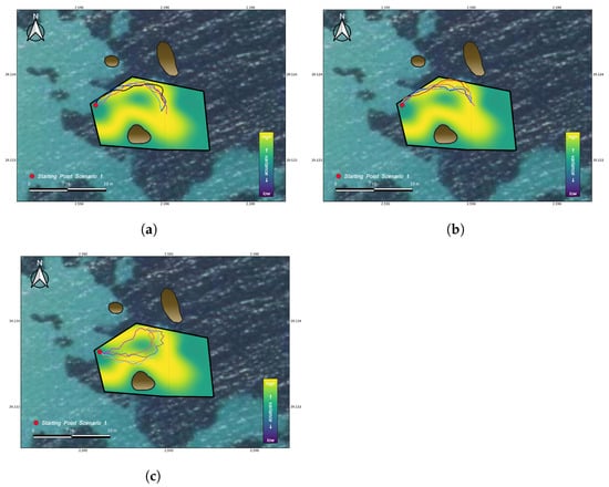 Five best paths Area 1-Scenario 1. (a) Genetic; (b) Random; (c) S-B.