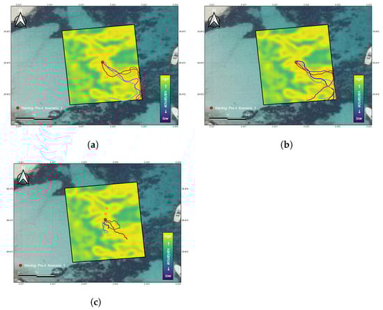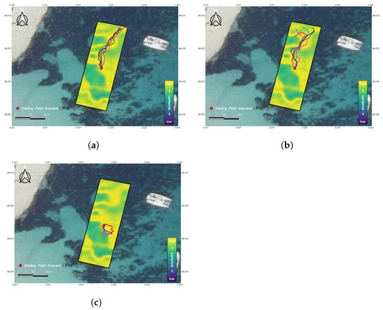 In each area, three different scenarios were considered by varying the origin point of the path. The extension and shape of PO meadow in the environment was modelled through a GP trained on data describing, in probabilistic terms, the presence of PO in a specific location of the target area. Such data were produced by segmentation of images through a pre-trained CNN. The training of the GP was carried out using GpFlow [], library of Tensorflow [], in Python environment. Figure 4 shows a satellite view of the three areas of inspection. In each of them, the variance map obtained by the GP prediction is represented as a colormap, where high variance regions are depicted in yellow, while the areas with low variance are displayed in blue. The a priori known obstacles are depicted in brown and the different starting points are shown on each map, respectively, in red, blue, and orange, according to their order.