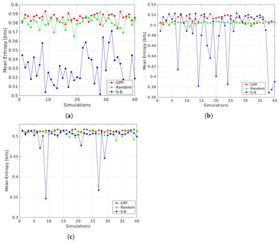 Mean Entropy over 40 offline executions in scenario 1. (a) Area 1; (b) Area 2; (c) Area 3.