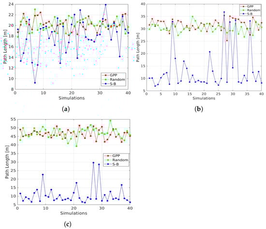 Path Length metric over 40 offline executions in scenario 1. (a) Area 1; (b) Area 2; (c) Area 3.