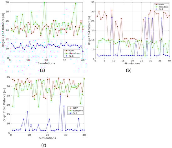 - Distance Origin to End (02E)This metric coincides with the variable adopted as contribution in the GPP utility function, indicated as . It specifies how far the final point is from the starting one, providing a sense of how spread the path is over the target area.