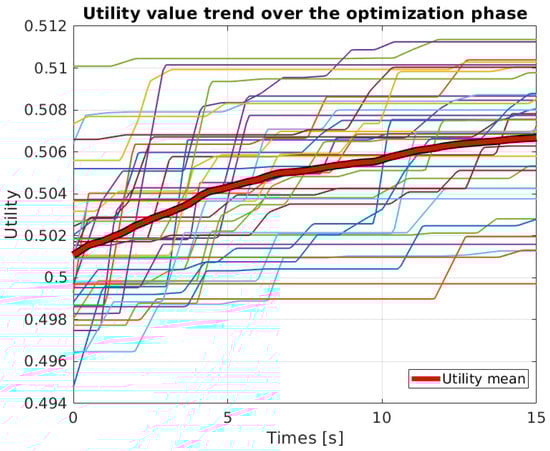 Analysing the percentage of times each planner performs better than the other ones in terms of ME only, the results are reported in Table 5. Figure 5, Figure 6 and Figure 7 show a subset of the paths generated by each investigated planner in the three areas of inspection. In fact, although 40 optimal paths have been generated for each trial, just five of them have been randomly selected and represented, in order to maintain a good readability of the figures. Instead, Figure 8, Figure 9 and Figure 10 display the plots of the ME, PL, and O2E values, respectively, over 40 trials for each planner in all the three geographic areas. For the sake of readability, only the plots of the first scenario for all the 3 areas of interest are reported. In fact, the other scenarios provide similar plots, without any anomalies in the results. Last, Figure 11 shows the trend of the utility value over each iteration of the GPP’s optimisation phase for 40 trials (Area 2-Scenario 1). In particular, the values represented at the initial time are the ones obtained at the end of the initialisation phase of each trial. Then, each iteration of the GPP algorithm tries to improve the utility value, which is therefore optimised over time. Moreover, the mean value of the utility at each iteration is shown in red to represent the mean trend obtained thanks to the optimisation procedure.
