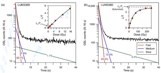 Shine-down curve and dose–response curve (inset) for two representative samples, LUM3369 (a) and LUM3380 (b). Results of component analysis of the quartz OSL signal are shown.
