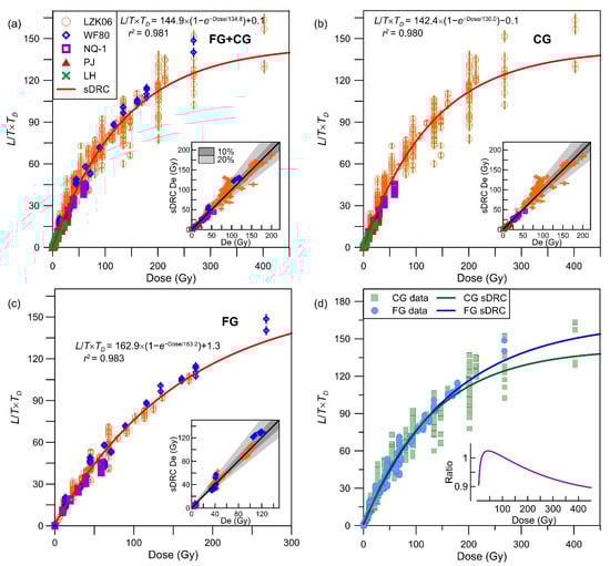sDRC construction following the approach of Roberts and Duller (2004). (a) shows the sDRC constructed using all OSL data of all the FG and CG samples. (b) shows sDRC constructed using OSL data of the CG samples. (c) shows sDRC constructed using OSL data of the FG samples. The insets show the comparison between the sDRC- and individual DRC-determined De values. The 1:1 line (solid line), 10 and 20% uncertainty (grey shadow area) are shown. (d) shows the sDRC comparison between FG and CG samples. Inset shows the L/T×TD ratio calculated using CG and FG sDRCs, respectively.