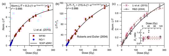 Luminescence data of the FG samples from cores WF80 and NQ-1 were used to construct sDRC after [], shown in Figure 5a. D0 value of the sDRC is 123.1 Gy, suggesting that the upper dating limit of FG quartz using this sDRC is approximately 70–80 ka with the typical environmental dose rate of 3–3.5 Gy/ka for FG quartz. Figure 5b shows the sDRC constructed following the method of [] using the same dataset. The D0 value of 249.7 Gy is much larger than that of sDRC following the approach in []. The normalized L/Ts by re-normalization dose (L/T13.95) are more concentrated and are better fitted than that of []. De values determined by the two sDRCs are compared with those of the individual DRCs using the De ratio (Figure 5c). De values determined by sDRC of [] generally agree with those by individual DRCs for the clusters of 3–8, 34–47, and 117–122 Gy. Most of the De values of [] are also accepted within 10% uncertainty, but it tends to underestimate the De values for the dose range of approximately 100 Gy. Outliers are also observed for the low-dose regions. Therefore, sDRC of [] could probably yield more reliable De values. It should be noted that an identical regenerative dose as the re-normalization dose should be given in the SAR protocol for the possibility of sDRC construction.