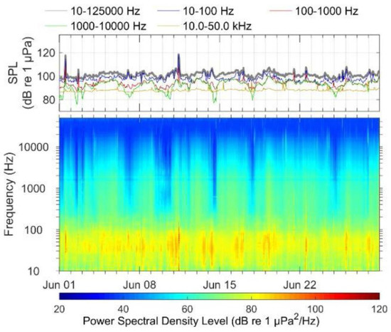 In-band SPL (top) and spectrogram (bottom) of underwater sound in June 2016 at Mooring 6 (reproduced from ObSERVE Programme Report [26], with permission from Department of Communication, Climate Action and Environment, 2018).