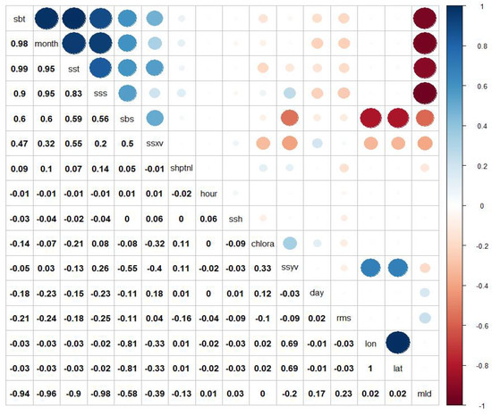 This correlogram was plotted using the corrplot() function (“corrplot” package). The size of the circle is directly proportional to the correlation coefficients while blue represents the positive correlations and red the negative. This figure indicates the measure of collinearity between the different variables used in the modelling.