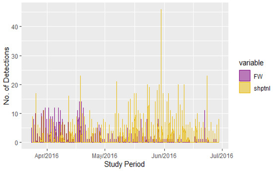 Time series graph showing variation of fin whale detections (FW) and shipping detections (shptnl) recorded over the period of study.