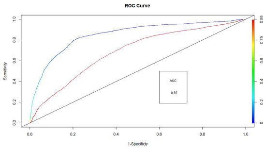 Even though high model accuracy (0.95) was estimated using a repeated 10 stratified k-fold cross-validation method, a very high sensitivity (0.99), and a very low specificity (0.04) suggested the presence of a caveat in the model. The prediction worked better to accommodate absence of fin whale detections rather than presence, leading to a type II error [39]. Despite the type II error, the area under the curve (AUC) of the model was high (0.85) and significantly different from a random model (AUC = 0.5) under the receiver operator curve (ROC) (Figure 5), indicating high model accuracy. Further, McFadden’s pseudo-R squared of 0.25 also confirmed the model as an extremely well-fitting one. Hence, the habitat model was accepted to be a good fit, which indicated the acoustic presence of fin whales to be strongly influenced by shipping noise and primary productivity.