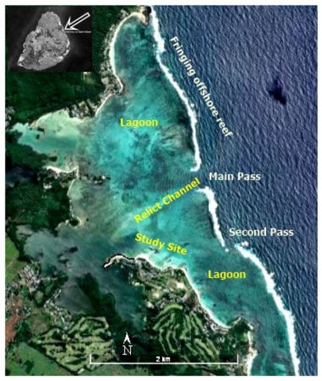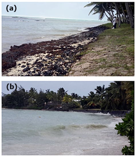 Many tropical islands have fringing reefs offshore, which break and dissipate waves to protect the lagoonal beaches from direct, open-ocean wave impact; without these reefs, most tropical island beaches would not exist. Wave height in the lagoon is controlled by water depth over the offshore reef crest [5,6,7,8]. Consequently, not only does sea level rise cause flooding, but it also allows larger waves to reach the defenceless lagoonal beaches, often with dire consequences, such as uncontrolled erosion and over-topping inundation [9].