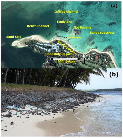 The “One&Only Resort” at Le St Geran, located on the north-east coast of Mauritius in the southern Indian Ocean (20.2° S, 57.8° E), is situated in a large coral reef lagoon. Key geomorphic features are the fringing offshore reef, relict river channels, two canyon “passes” in the fringing reef and the broad lagoon (Figure 1). The resort is built on a sand spit (Figure 2a) with underlying rock substrate. The erosion zone considered in this paper is situated in the lee of a low island (Ilot Banane) (Figure 2b). In the year 2000, three very small circular reefs were placed nearshore, while rock-filled gabion baskets were laid along the shoreline. However, continued erosion made the beach unsuitable for resort guests by 2015 (Figure 2b and Figure 3). A reef with associated nourishment, constructed in October 2017 to repair the beach, is the subject of this paper.