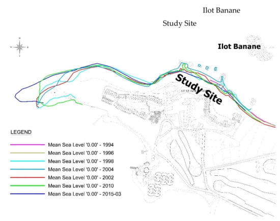 Ideally, an artificial reef should change the equilibrium position of the shoreline to widen the beach but still allow a net movement of sand to pass freely. At the study site, small waves and currents drive a consistent net sediment transport to the east. Consequently, the reef was designed to attach to the western side of Ilot Banane. This allowed the dominant wave on the eastern side to remain intact so that sand delivery from east to west could continue uninterrupted. The 95 m length of the reef was adequate to shelter the shoreline of interest while also giving partial wave protection to the corner of an adjacent beach.