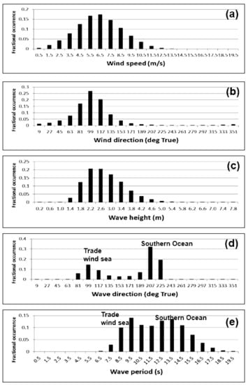 The winds in Mauritius are most commonly 5–8 ms−1 from 80–120°Ttrue (Figure 4a,b). Hindcast wave data from the Wavewatch III model [16,17] over 36+ years shows two common wave conditions. The south-east trade winds from 80–120° true generate heights of 2–3 m and periods of 8–10 s (Figure 4c–e). The second common condition is associated with Southern Ocean lows, generating distant swells arriving from 200–230° true with heights exceeding 2 m and common periods of 14–15 s. The island of Mauritius blocks the Southern Ocean swells at the study site, and so the south-east waves predominate. Occasional cyclone waves from the northerly quadrant have heights exceeding 7 m (Figure 4c,d).