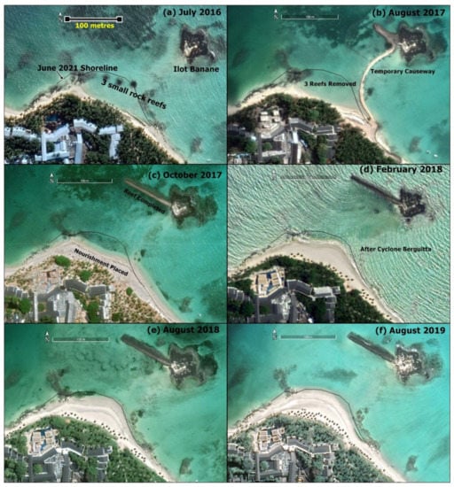 The construction and nourishment were conducted over 3 months and completed in October 2017. For ease of construction, a temporary causeway was built using sand-filled geotextile bags to link the shoreline to Ilot Banane (Figure 5a,b). This allowed machinery and rock deliveries to reach the island with minimal cost and environmental impact. An excavator placed the rock. When complete, the causeway was removed by spilling the sand from the geobags (which were taken back to shore) (Figure 5c), while the loose sand formed part of 12,000 m3 of nourishment placed on the beach in the lee of the reef (Figure 5c). Nourishment sand was extracted from the sand spit, located 600 m to the west (Figure 2a), and back-passed onto the eroding beach by truck.