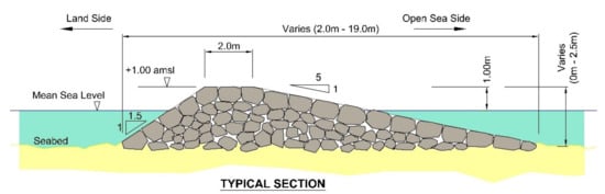 The reef crest was set to be marginally above the spring high-tide level. In combination with rough boulders and a lower gradient on the open-sea side (Figure 6), the waves are dissipated by the reef for most of the time. Waves may overtop only in extreme conditions when sea levels are higher due to non-tidal influences. If the crest was lower, wave-driven currents over the reef crest create a looping current, which travels over the crest to the lee of the artificial reef and returns around the tips of the reef (the same patterns can be seen on the natural fringing reef in Figure 7). These currents around the artificial reef have been shown to induce scour in the lee of the reef [18,19,20]. Consequently, if the crest is submerged, the artificial reef needs to be placed further offshore to allow the scour to occur well beyond the beach rather than cutting into the beach itself. This distance was not possible at St Geran, and so the crest was put just above spring tide level to minimise over-topping-induced scour while keeping the crest down for visual amenity purposes. The wave heights in the lee of the reef were reduced due to the extra sheltering (Figure 5d).